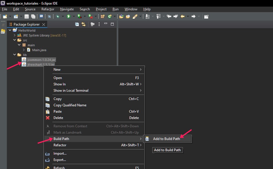 • Selecciona el/los archivo/s .jar y haz click derecho sobre ellos / opción Build Path / opción Add to Build Path.
