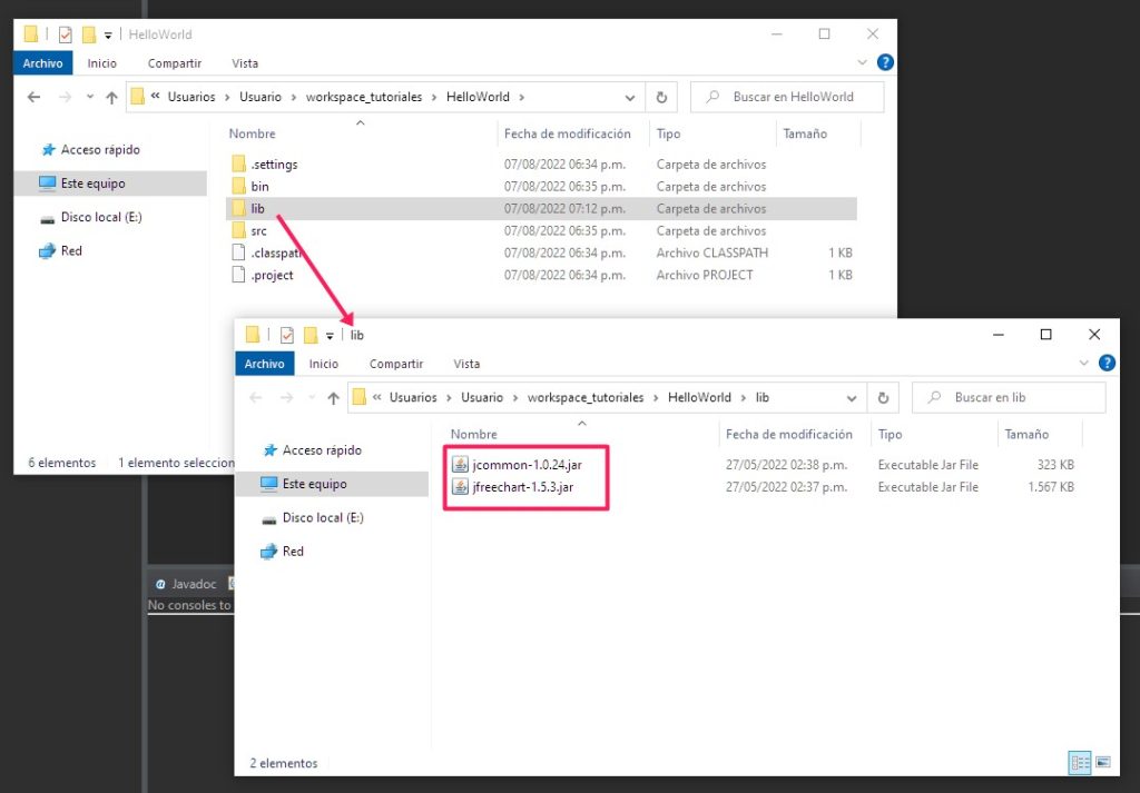 • Vuelve a Eclipse, en el explorador de proyectos haz click derecho sobre la carpeta del proyecto / opción Refresh. Ahora verás la carpeta lib y dentro de ella los archivos .jar.