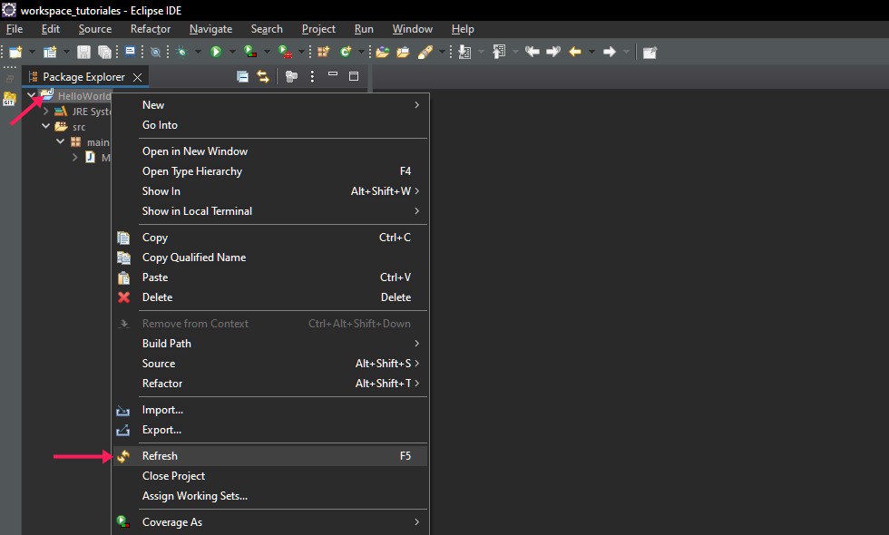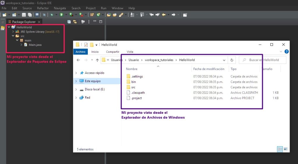 • En el explorador de archivos de tu computadora, abre la carpeta de tu proyecto Java (usualmente dentro de la carpeta de tu workspace de Eclipse).
